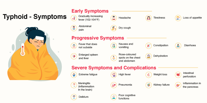 Typhoid fever presents a wide range of symptoms that develop gradually over days.